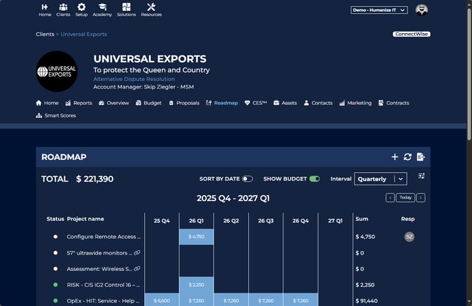 The Roadmap contains all of the items that are active in your Client. These may include Projects, Opportunities, or ongoing services. Each item can be edited in several ways to create a unique technology roadmap to communicate with clients.