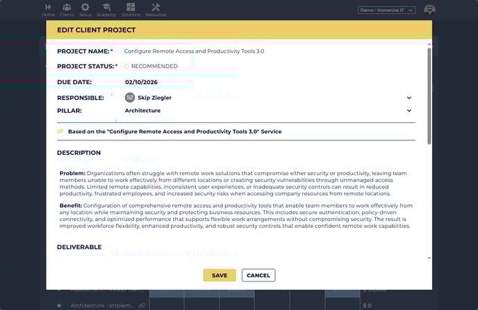 You can now edit any part*. If the project was added using a template from the Service Catalogue, all of the information has been copied into this project. Once a project is on a client's Roadmap, it is unique. Changes to the template will not be reflected here and none of the unique data added will be visibile outside of this client.