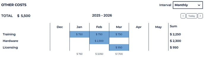 When entering a cost, click on the time box you want to put it in. Use the Interval selector to view Monthly, Quarterly, or Annual intervals. Costs that are added at the Quarterly or Annual level will automatically divide the amount and apply it monthly.